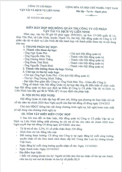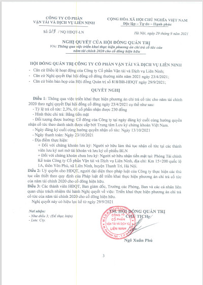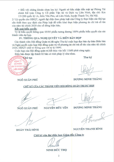 Biên bản họp HĐQT và nghị quyết HĐQT thông qua việc triển khai thực hiện phương an chi trả cổ tức của năm tài chính 2020 cho cổ đông hiện hữu