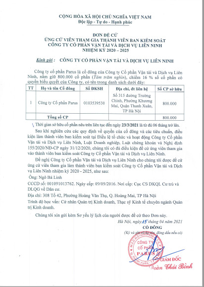 Đơn đề cử ứng cử viên tham gia thành viên Ban Kiểm Soát