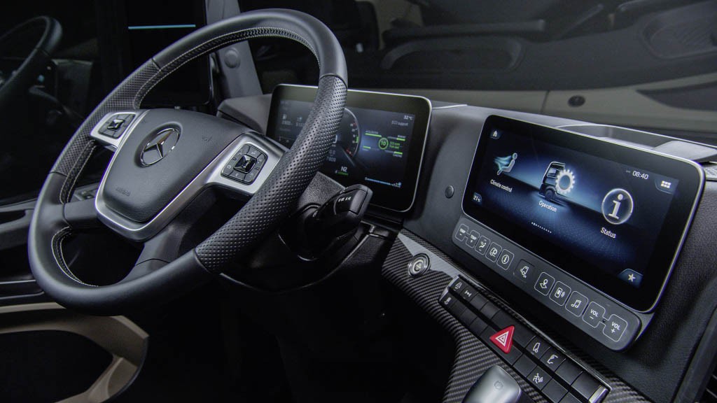 Là mẫu xe tải nặng đường dài, khoang cabin của chiếc Actros được Mercedes-Benz chú trọng thiết kế với nguyên lý người-máy (HMI) mang đến cho người lái sự thoải mái sau những giờ lái xe căng thẳng. Hệ thống thông tin giải trí Multimedia Cockpit với hai màn hình hiển thị rất hiện đại, được tích hợp trong khoang lái, hệ thống này hỗ trợ khả năng kết nối các thiết bị thông qua qua Apple CarPlayTM và Android Auto.