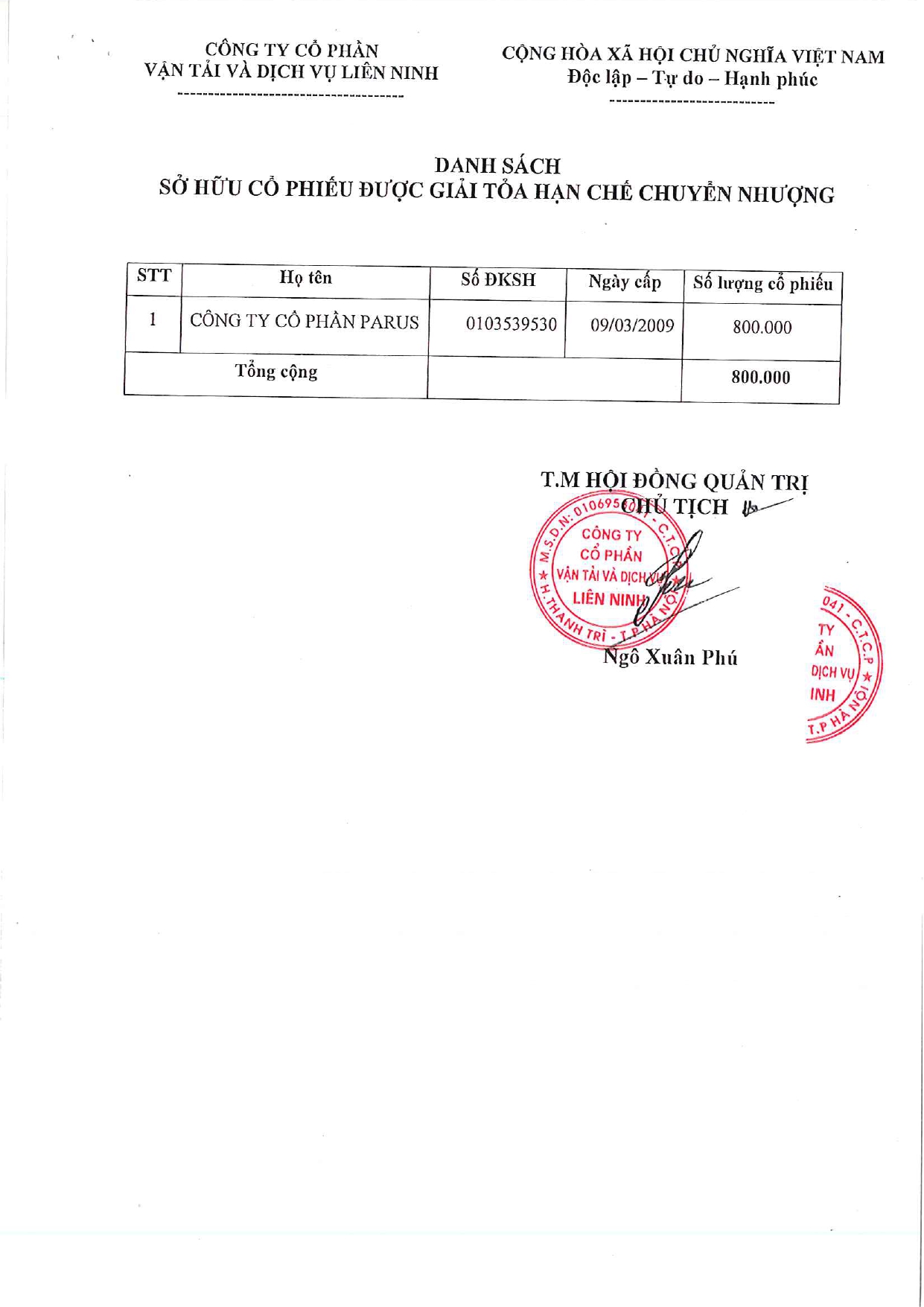NGHỊ QUYẾT HỘI ĐỒNG QUẢN TRỊ CÔNG TY CỔ PHẦN VẬN TẢI VÀ DỊCH VỤ LIÊN NINH