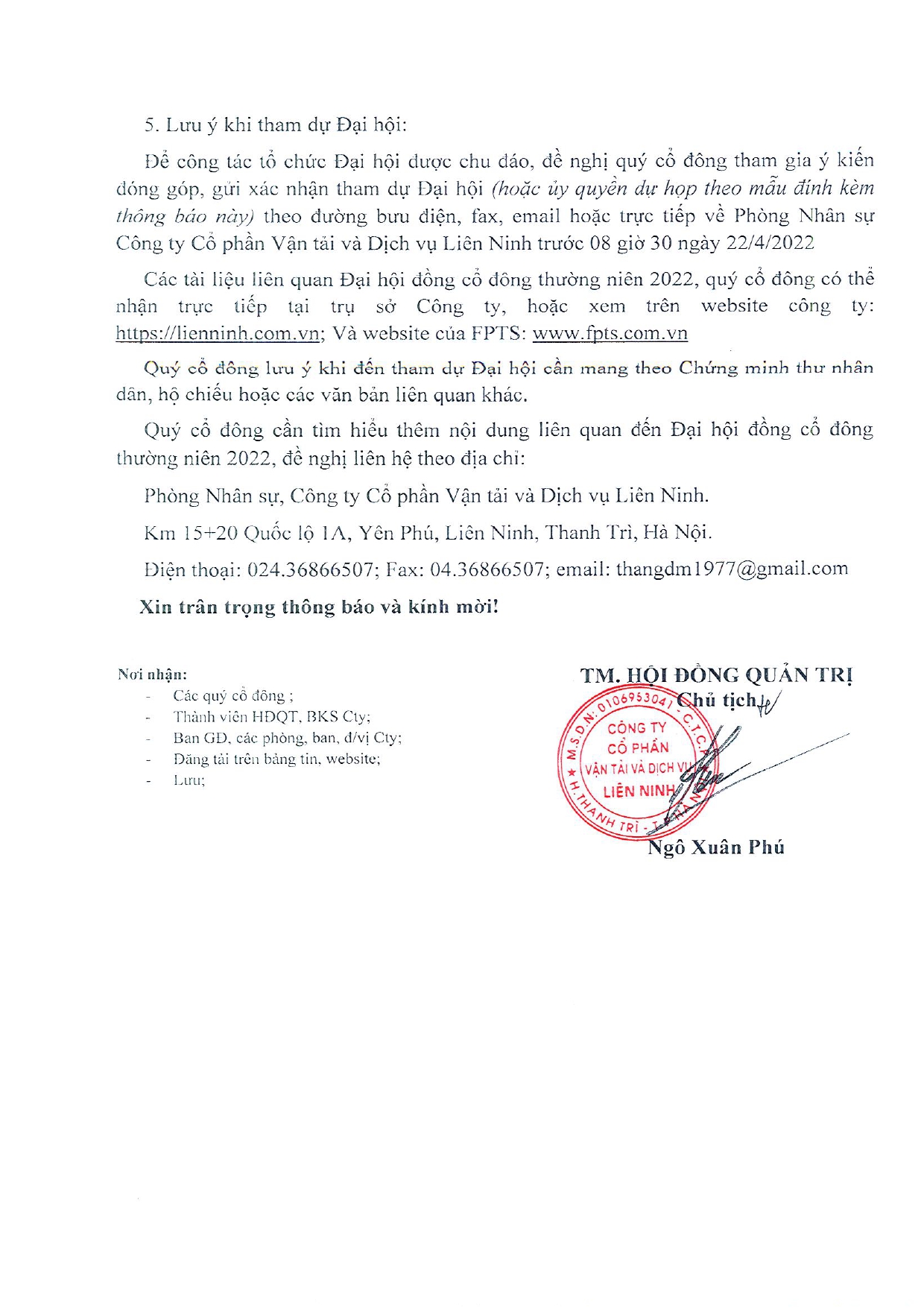 THÔNG BÁO MỜI HỌP ĐẠI HỘI ĐỒNG CỔ ĐÔNG THƯỜNG NIÊN NĂM 2022