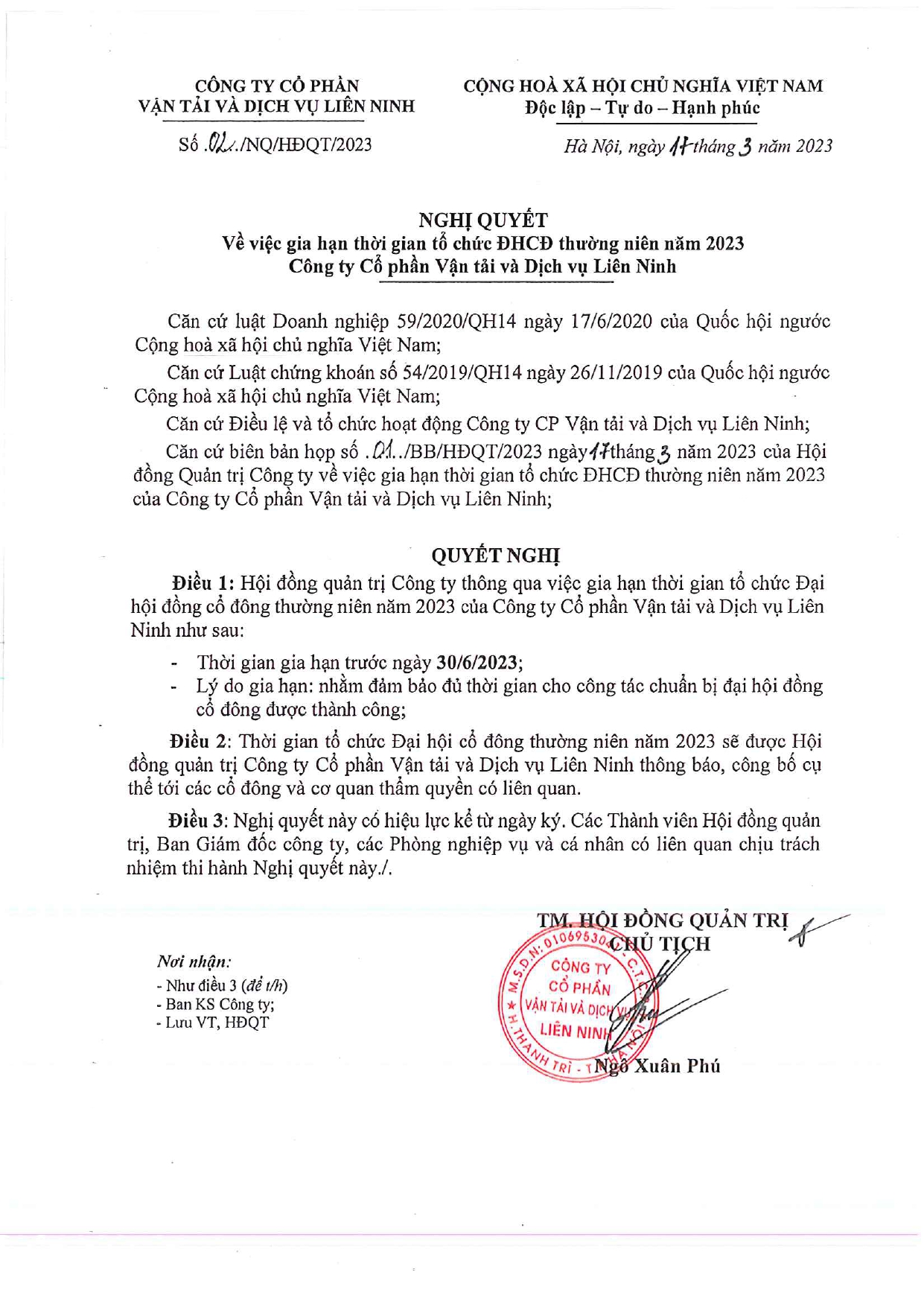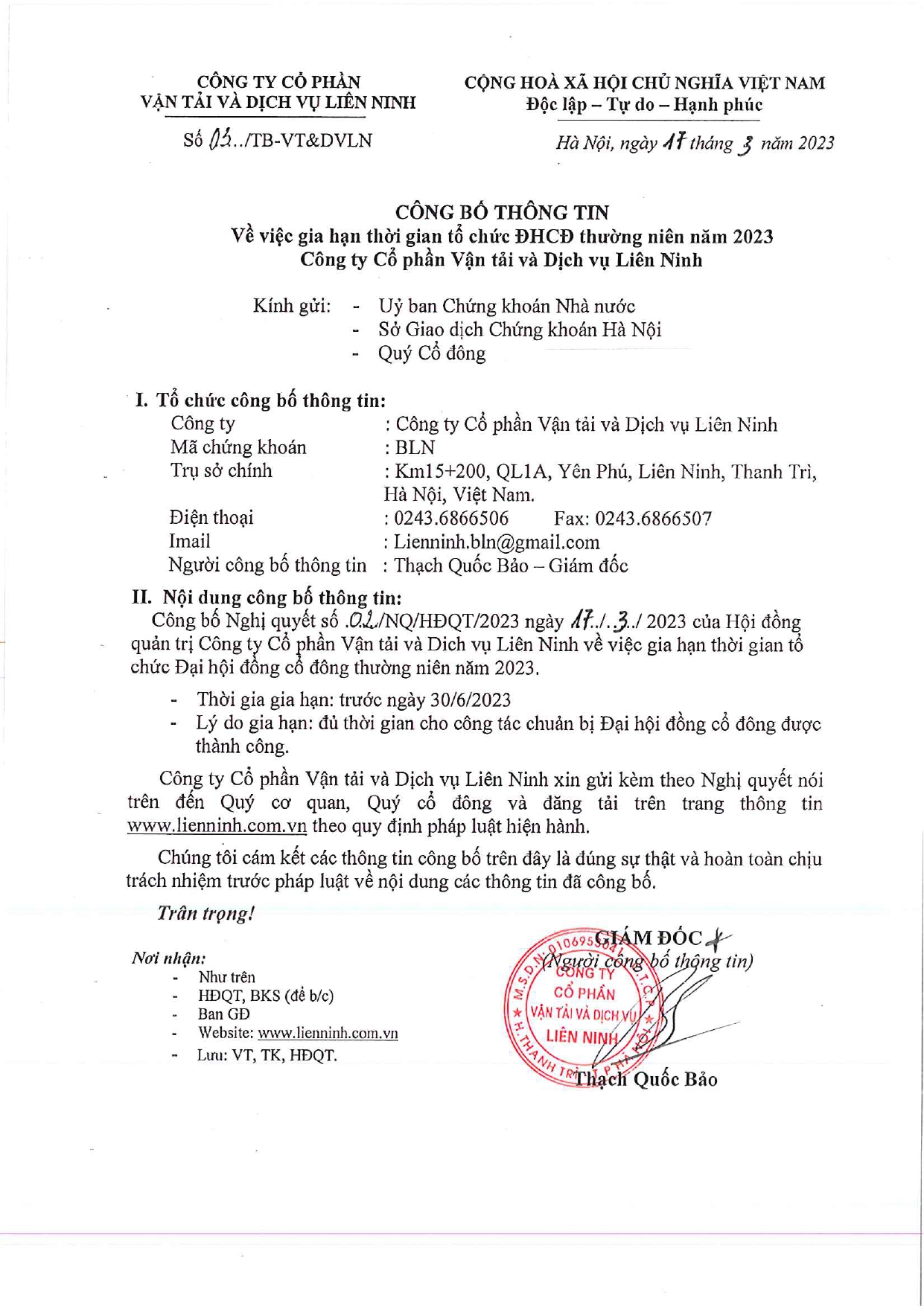 THÔNG BÁO VỀ VIỆC GIA HẠN THỜI GIAN TỔ CHỨC ĐẠI HỘI ĐỒNG CỔ ĐÔNG THƯỜNG NIÊN NĂM 2023