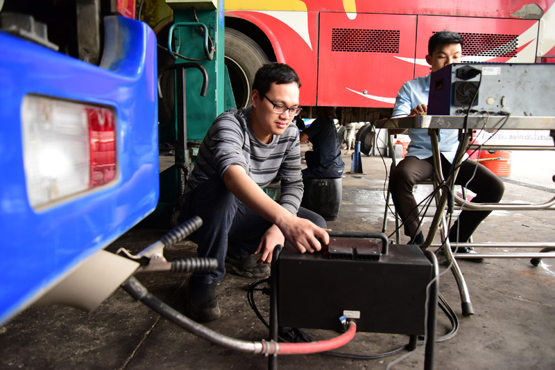 Cán bộ kỹ thuật xí nghiệp xe buýt 10 – 10 kiểm tra hệ thống xả khói của xe, đảm bảo lượng khí thải không gây ô nhiễm môi trường